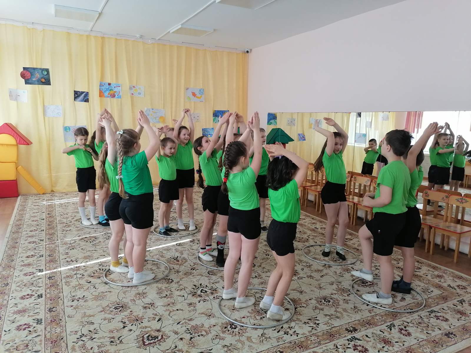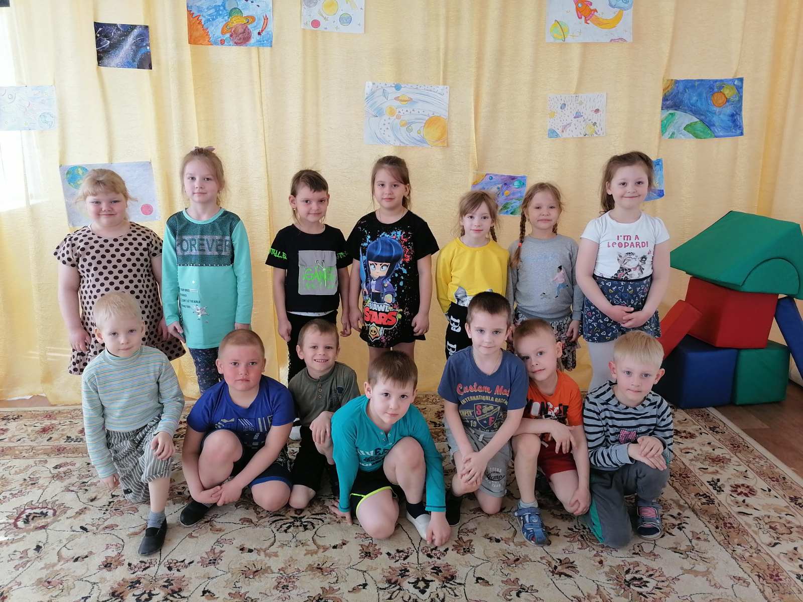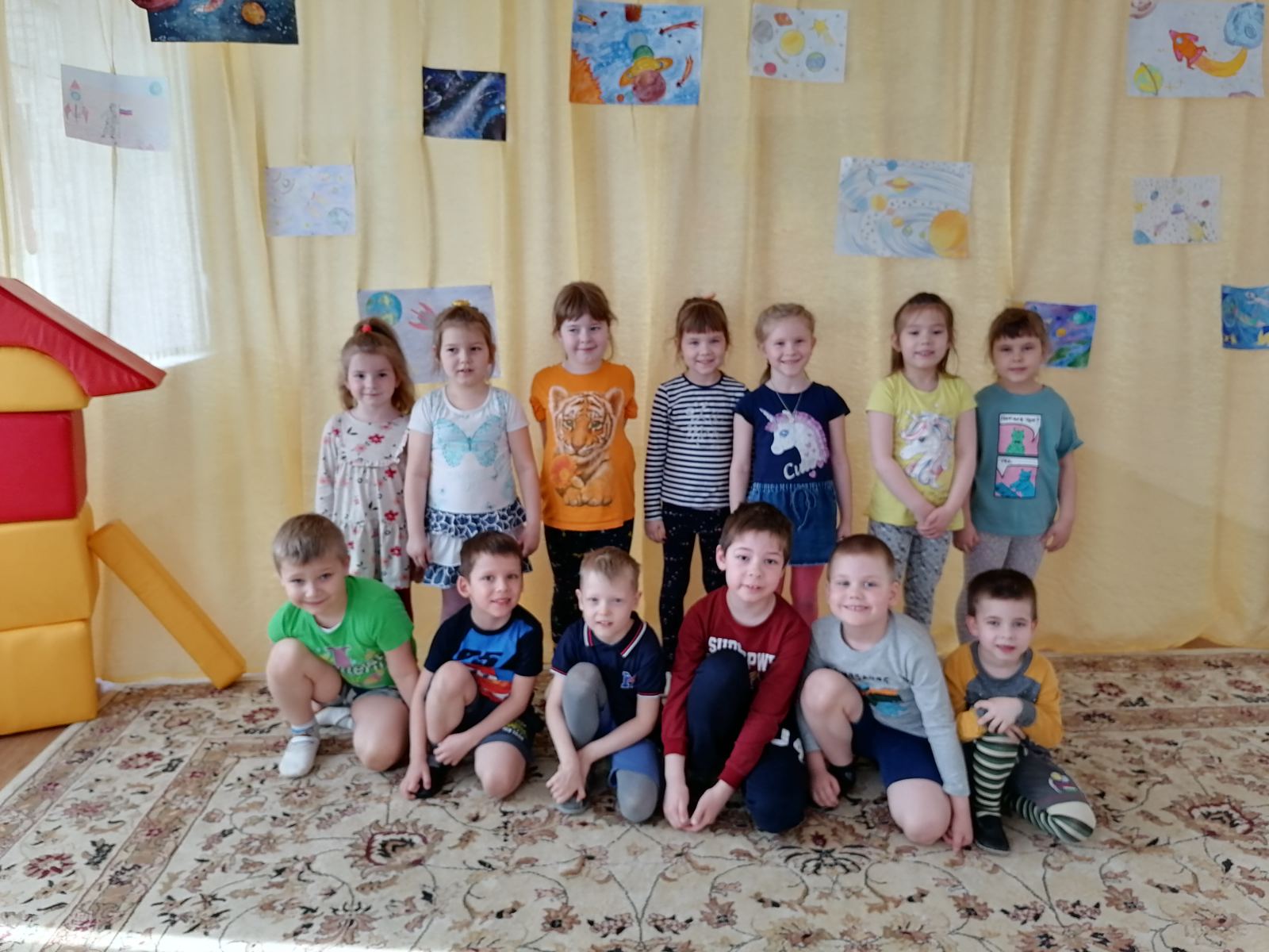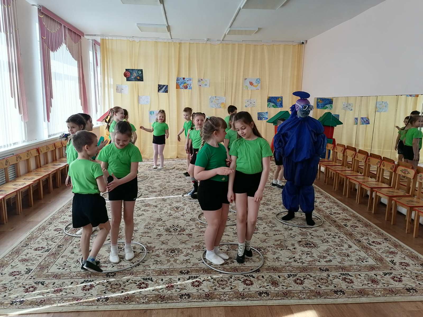 Попрощавшись с инопланетянином, дети сели в ракеты и вернулись на Землю, в любимый детский сад.