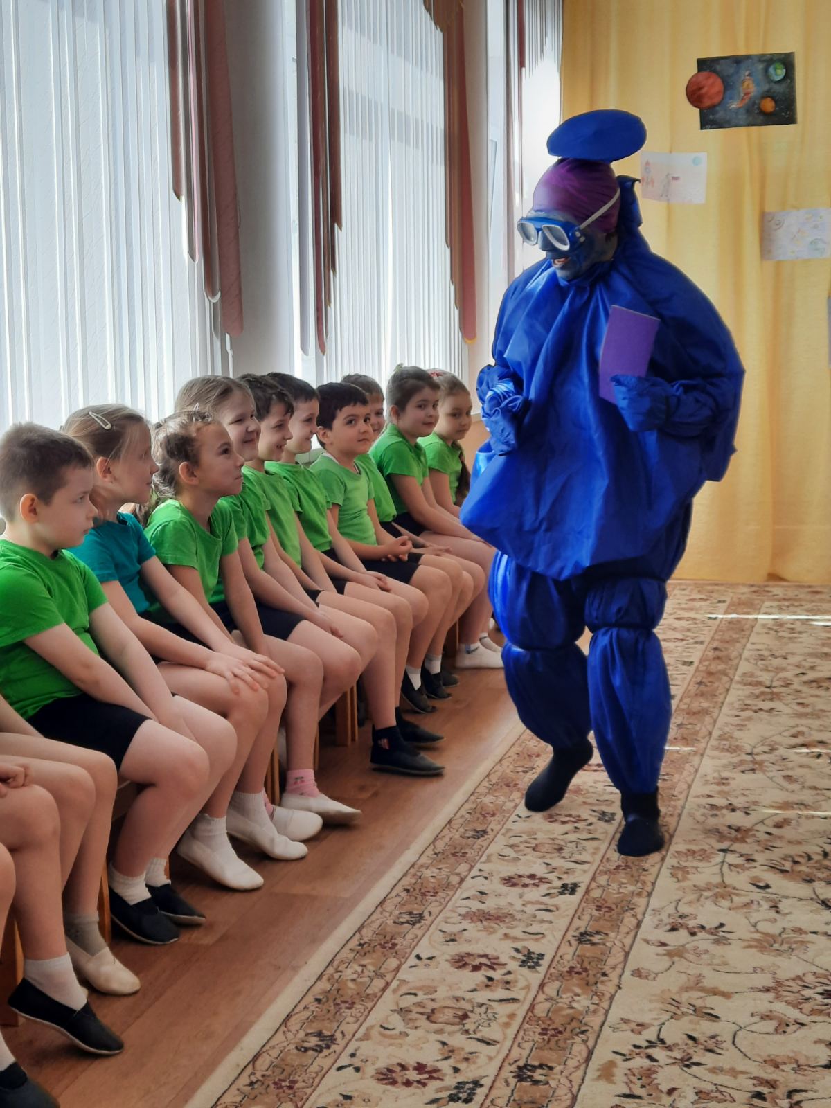 Начался праздник для детей с игры – викторины «Всезнайка», в ходе которой ребята закрепили свои знания о космосе. А в тот момент, когда дети рассуждали на тему «Есть ли жизнь на других планетах?», раздались странные космические звуки. Оказалось, что это на нашу планету прилетел инопланетянин. Ребята захотели с ним подружиться и решили отправиться в полёт на Луну, предварительно размявшись на космической зарядке.