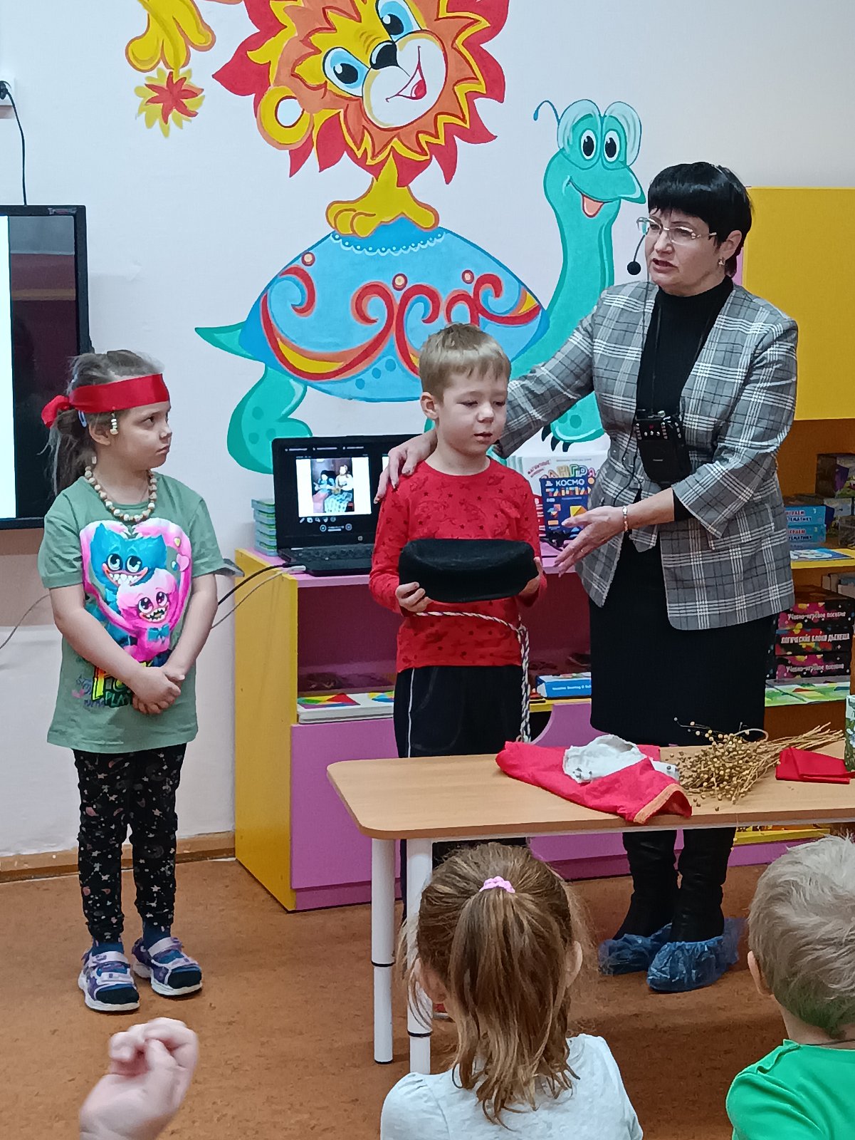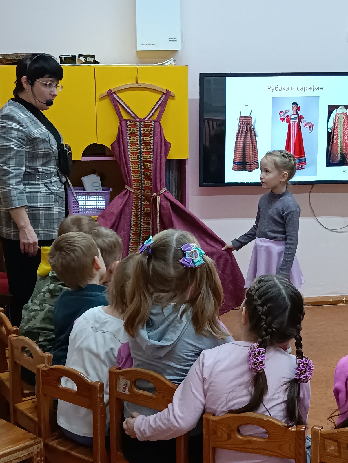 Наши старшие дошкольники всегда с нетерпением ждут в гости Ирину Михайловну, работника Ковровского историко-мемориального музея. Она проводит с детьми интереснейшие занятия. В этот раз Ирина Михайловна рассказала ребятам про русскую народную одежду. Дети узнали про главные элементы народного костюма, как украшали раньше одежду. А некоторые девочки и мальчики смогли даже примерить на себя старинные предметы одежды и головные уборы.